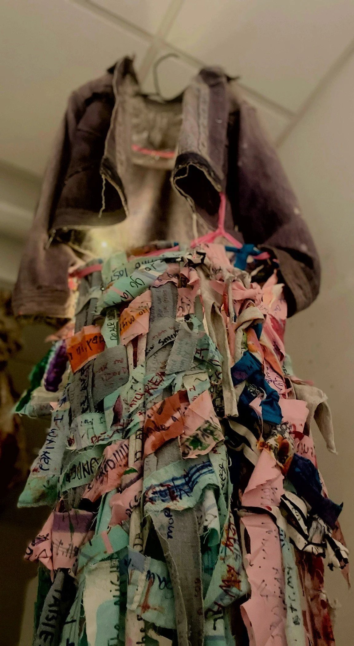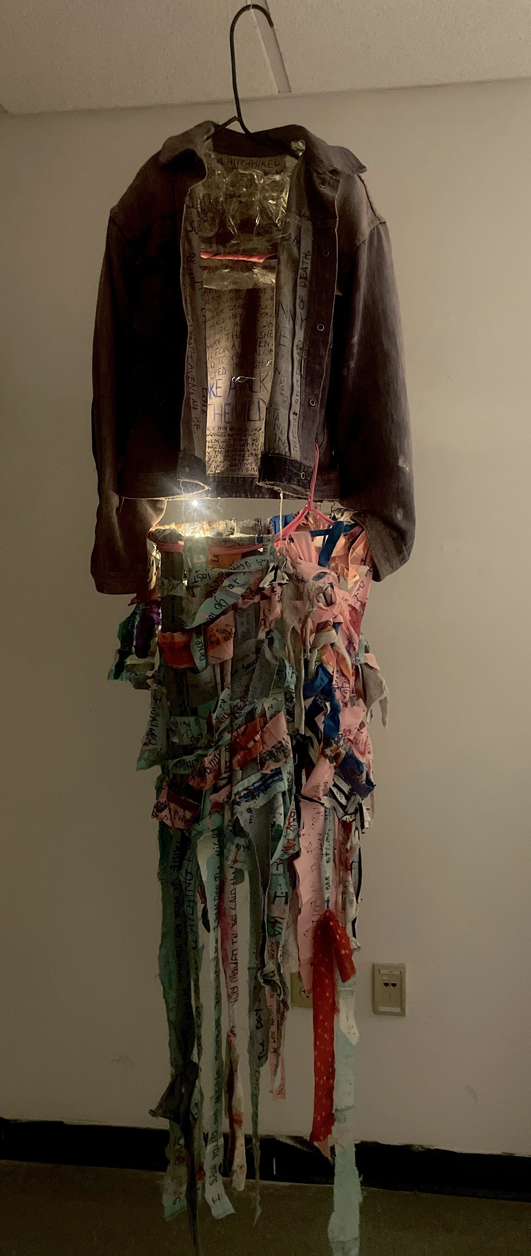 Medium: My memories and The ones of friends , old Tshirts, Sharpie and paint , a jean jacket and some string lights
